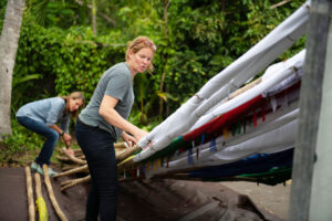 For the people of Bhutan, flags are related to the spiritual and natural worlds as signs of protection, peace, compassion and strength, among other meanings. In Dorado, the Pterocarpus Forest has been a place to reflect, to find peace and to connect with nature; it has also faced the furious cyclones, protecting part of Dorado Beach and losing many trees. This is why artist Zaida Goveo joined the Grupo Nosotros to pay homage to these silent heroes, using the wind that makes the flags flutter as a compositional element while intertwining all these meanings in one piece.