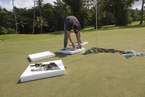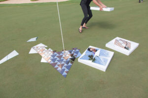 Artistic intervention in one of the golf holes, made out of a composition of triangle shaped mirrors of three different tones.