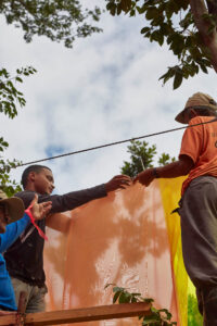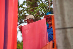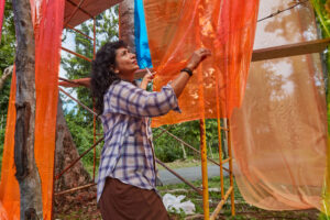 In her practice, painter Ivelisse Jiménez has explored the limits of chromatism beyond painting and canvas, filling entire spaces with color without the need for a brush. The artist uses processed materials, such as fabrics, plastics and pastes, along with acrylic paintings to create bright compositions that surpass the limits of a frame. “Kaleidoscope” is her first intervention into the woods, and she used the forest itself as support for the work.