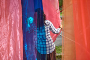 Transforms a forest into a vivid maze of color, using fabrics, plastics, pastes, and acrylic paintings. The installation immerses viewers in a labyrinth of vibrant hues, evoking the sensation of stepping into a dynamic, living kaleidoscope.