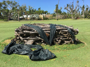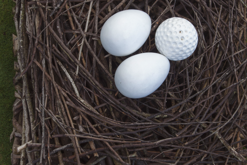 In Hole in One Jaime Rodriguez Crespo studies the unnoticed intrusion of human involvement in nature amongst natural objects. Just as a golf course consists of an artificial landscape made up of natural elements, the artist creates a bird’s nest that has obviously succumb to human imposition due to its size and placement as a site-specific sculpture. The similarity that exists between the two eggs and the golf ball also addresses the artificial nature of the landscape: as a synthetic object blends in with organic elements.