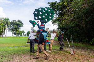 Metamorfosi, is a unique piece that features three wooden sculptures that stand on their own, each representing the cycle of growth, change, and renewal found in nature. These sculptures resemble humanoid plants and trees, showcasing the beauty of natural transformation as they react to the elements around them—wind, rain, sun, and more—changing colors and textures over time.