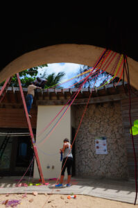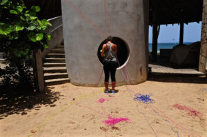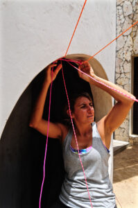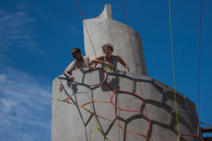 An art installation with a central tower surrounded by angled, colored strings connecting to surrounding buildings, evoking molecular structures. It dynamically interacts with light, creating mesmerizing visual effects.
