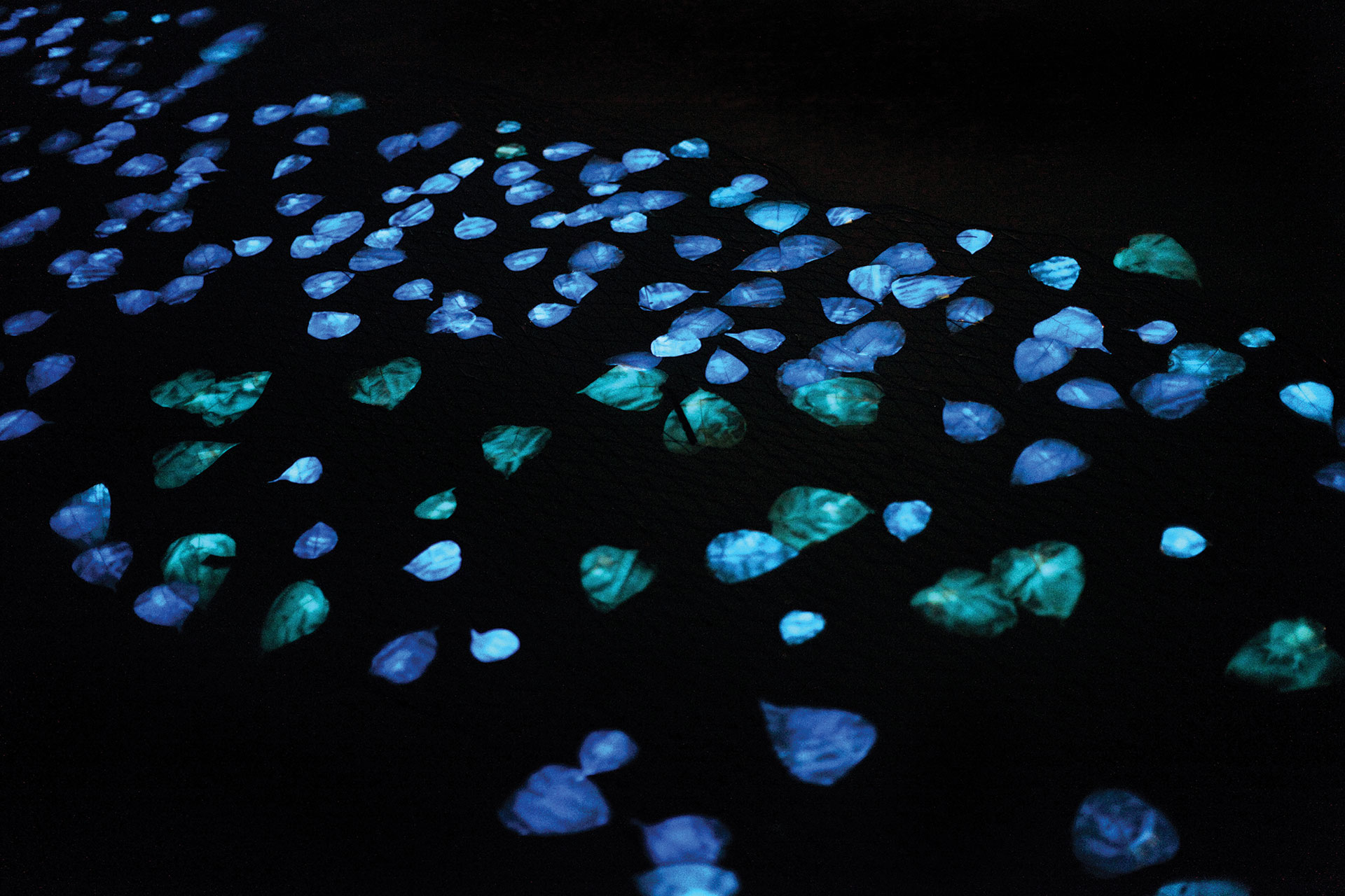 Aquatic installation based in floating leaves made out of a glow in the dark resin.