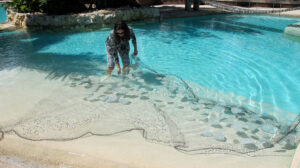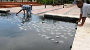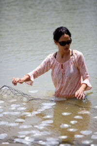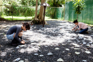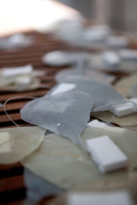 As part of arte_FITS’s Art in Nature projects, in 2012 the foundation was able to collaborate with artist Miya Ando for her project Obon [Puerto Rico]. “Obon made use of natural materials found at Dorado Beach to create Land Art water work”. In her proposal for Obon, Miya Ando explained that the concept was going to be the creation of small boats made out of Ficus leafs for they “served as an ecologically friendly, poetic notion of a floating, ephemeral boat utilizing native flora”. The Ficus leaf boats were glued to a net and coated with non-toxic phosphorescent pigment that was invisible in daytime yet visible at night when it emitted a soft blue-colored glow. This visibility was due to the sunlight that the pigment was charged with during the time of day. Since it was an ephemeral installation, the leaves only floated for a short period of time before biodegrading into the water and becoming part of the environment.