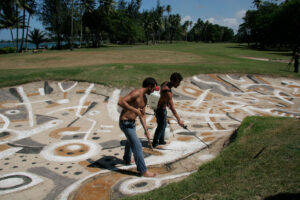 March 2010 – Days before the intervention, the artists collected the multi-colored pigments that would shape the pictorial design covering the sand trap.