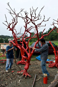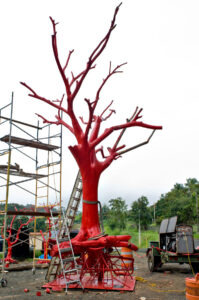 Sculpture made out of a dry tree, painted in red, transported and installed in the lake.