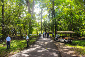 Installation that consist in invented letters that imitates the Japanese language, made of plastic and hanged from trees.