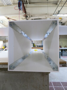 Light installation projected over wood pieces hanged in the air, activated by movement sensors that responded to the wind speed.