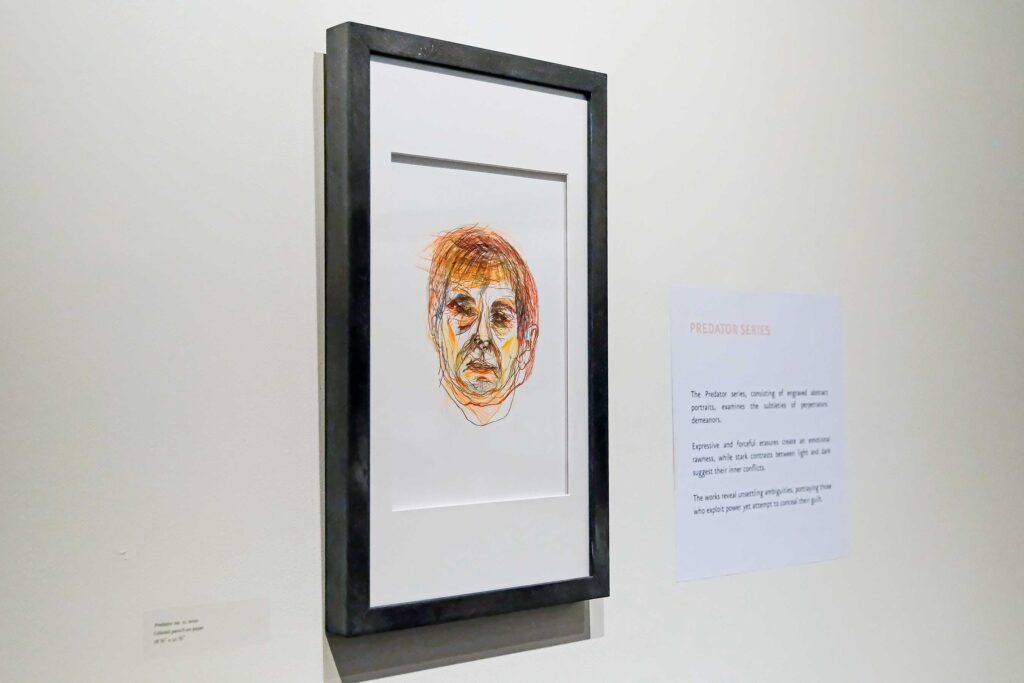 The Predator series, consisting of engraved abstract portraits, examines the subtleties of perpetrators’ demeanors. Expressive and forceful erasures create an emotional rawness, while stark contrasts between light and dark suggest their inner conflicts. The works reveal unsettling ambiguities, portraying those who exploit power yet attempt to conceal their guilt.