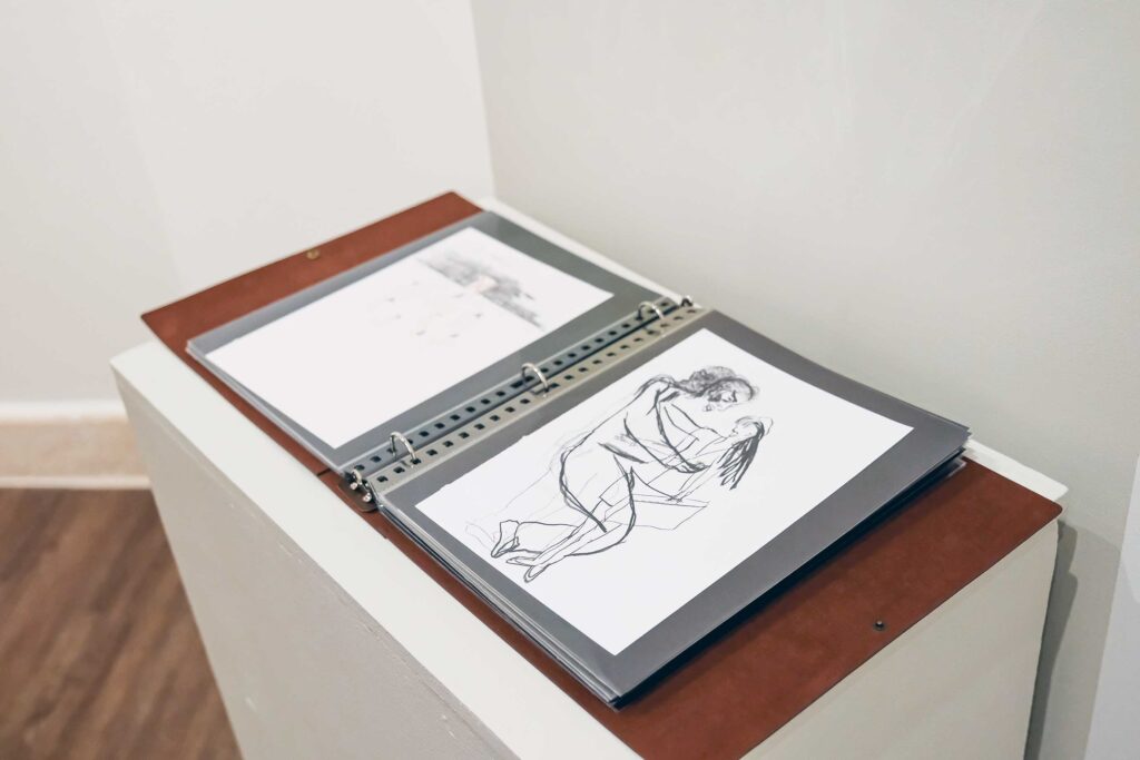 Complicit Public Diversions, a series of gestural ink drawings, examines the culture of complicity that enables abuse to persist. Chaotic yet rhythmic arrangements convey movement and disorientation, while faceless figures point fingers and deflect blame, further silencing victims. These works highlight not only the perpetrators but also the systems and individuals who perpetuate cycles of harm through willful ignorance or inaction.