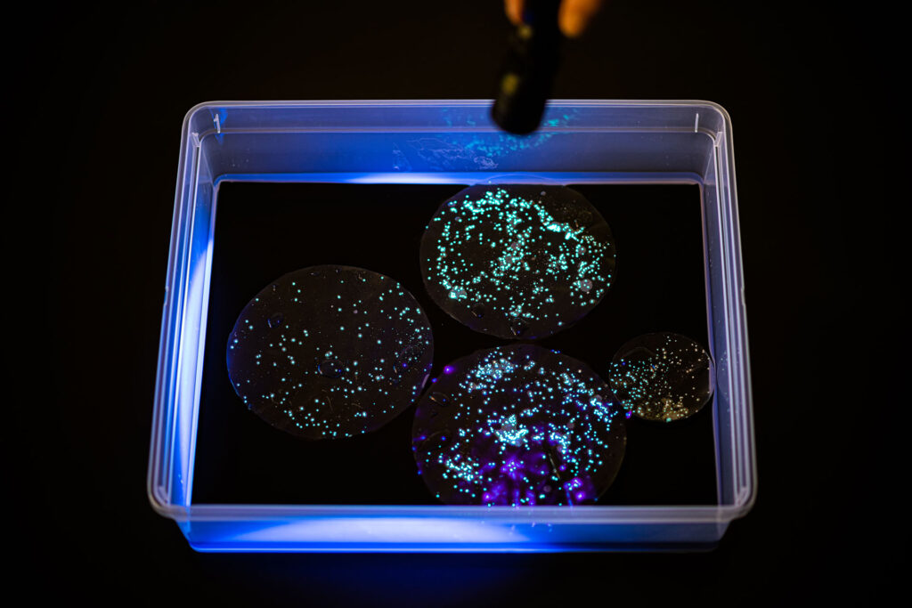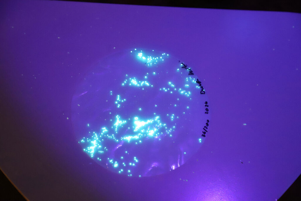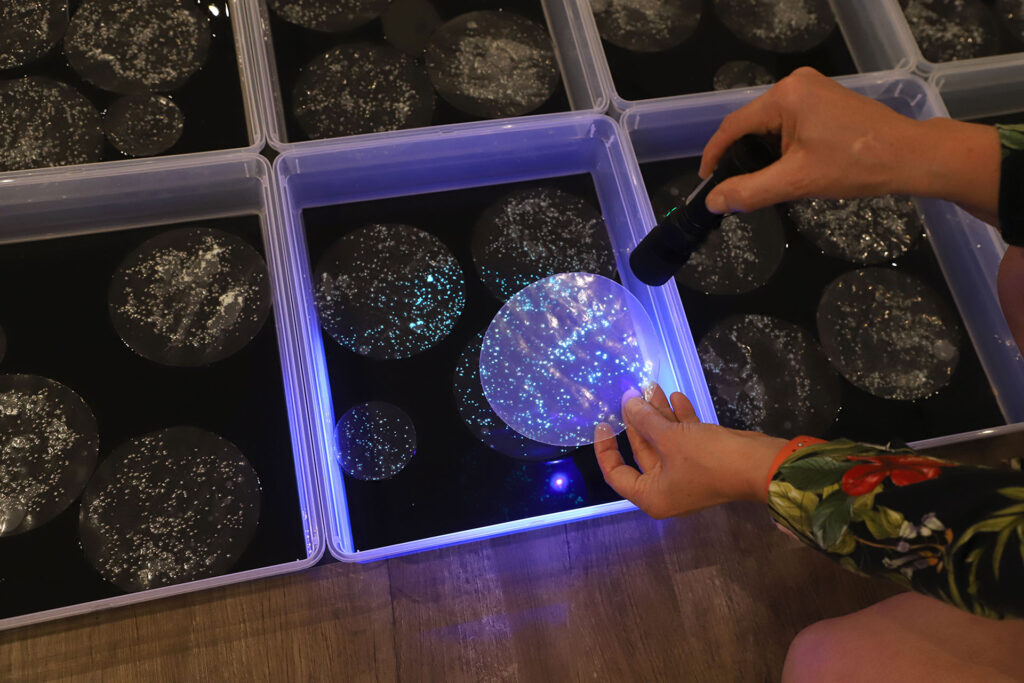 She was inspired by the special algae dinoflagellates living in waters around Puerto Rico. The bioluminescence phenomenon makes the water surface glow in a green- blueish color due to chemical processes and microorganisms.