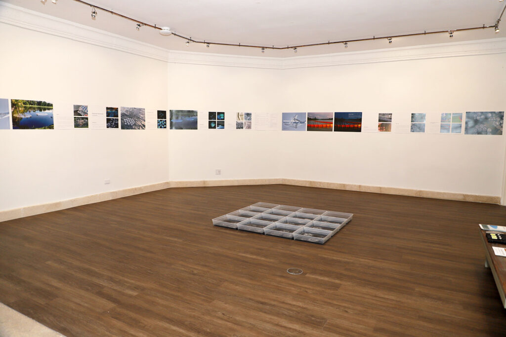 “Danu-Flagellates” is an immersive installation centered around small circular “islands” that float on the surface of water, ranging in diameter from 8 to 15 cm.